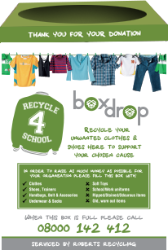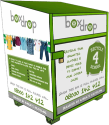 Option 1: EXTERNAL CLOTHING BANK : If required we can deliver an external clothing bank to your site. They are ideal for a school, looking to save space. They are bright, colourful and have all the relevant information on the outside of the bank. The dimensions of the metal bank are as follows: H: 165cm, W: 114cm, D: 114cm. We pay £400/ton (40p/kg) There is currently a small waiting list.
